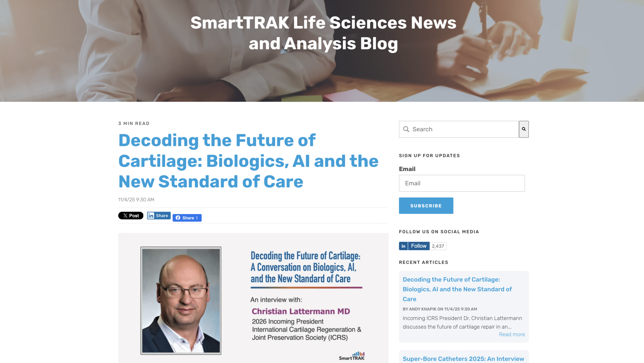 In this interview, SmartTRAK speaks with Christian Lattermann, MD, our ICRS president, about the future of joint repair. He shares insights on emerging technologies, highlighting advances in mechanical correction, AI and biologics.