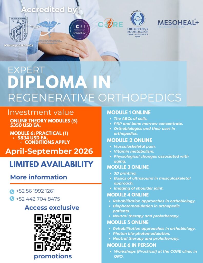 This diploma program is organized by CORE Clinic, directed by José Carrillo, and by Dr. Jorge Fajardo Chávez, member of ICRS, in Mexico. It is offered in five online modules and a final in-person module with live practical sessions.